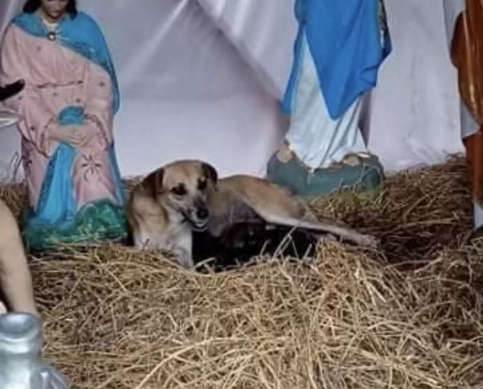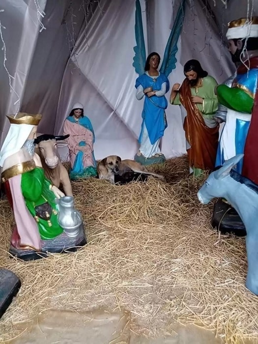 No início desta semana, um doce cão vadio evidentemente notou a cena da Navity – e decidiu reivindicar a manjedoura dentro dela como sua.