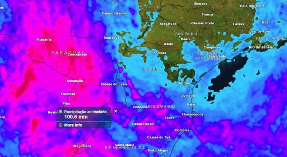 Na sequência, o avanço de uma massa de ar frio muda o padrão do tempo no Sul. Na quarta-feira, esse ar mais frio deve atingir o Rio Grande do Sul e alcançar parte de Santa Catarina, o oeste do Paraná e o oeste de Mato Grosso do Sul, segurando as máximas perto dos 20°C nessas áreas.