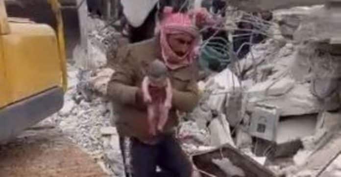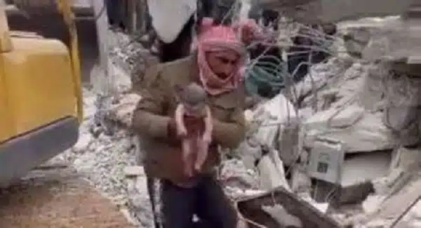 Pouco depois, um vídeo publicado nas redes sociais mostra um homem carregando um bebê nu e coberto de poeira pelos escombros, com o cordão umbilical ainda pendurado.