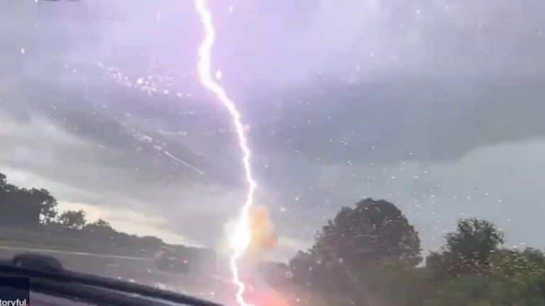 Michaelle Whalen dirigia atrás do marido, em outro veículo, pela rodovia l-75, em São Petersburgo. A mulher estava filmando o temporal quando de repente um raio acerta em cheio o carro da frente. Podemos ver as faíscas saindo e logo depois um estrondo forte.