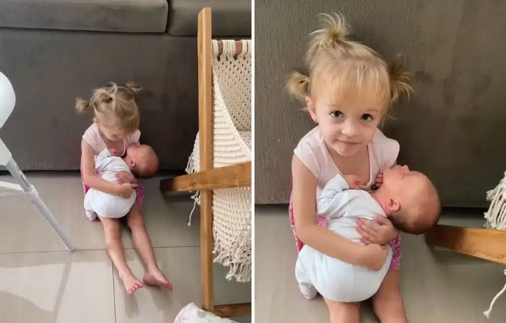 Laura, a primogênita de 2 anos e nove meses, surpreendeu a todos ao ser encontrada segurando a irmãzinha com carinho, fora do berço. Keila, ao ver essa cena, não pôde evitar a mistura de susto e emoção…