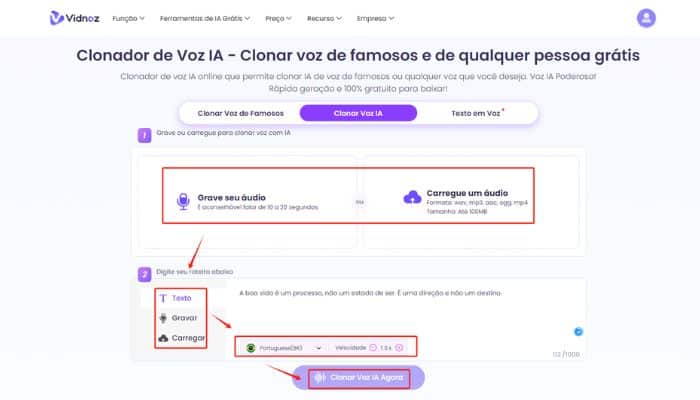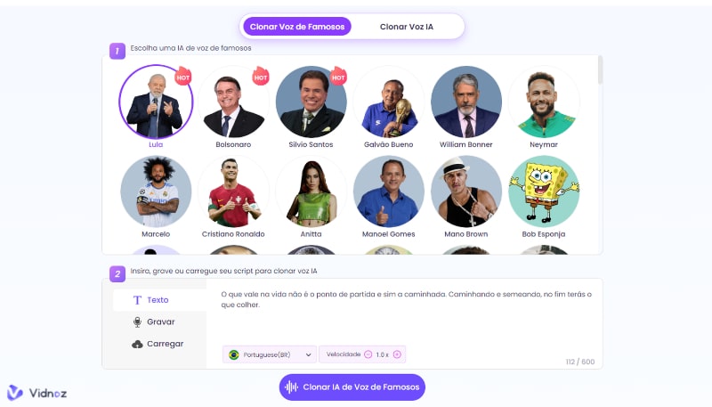 A função Clonar Voz IA permite que os usuários criem um clone digital de suas próprias vozes ou de outras vozes, o que pode ser extremamente útil para criar dublagens consistentes ao longo de uma série de vídeos. Usando algoritmos avançados de IA, o Vidnoz pode replicar tons, padrões de fala e até mesmo emoções da voz clonada, proporcionando um áudio fiel ao original. Além disso, a biblioteca de voz do Vidnoz também oferece aos usuários mais de 100 vozes de IA de celebridades, o que pode adicionar mais diversão aos seus vídeos.