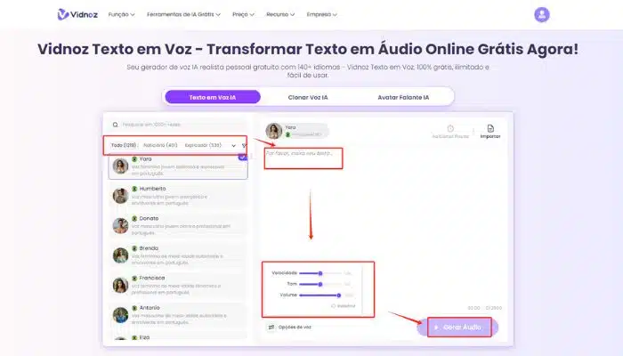 O Vidnoz aproveita diversas ferramentas de IA para acelerar a dublagem de vídeos. Ele oferece soluções que facilitam a criação de vozes sintéticas e clones de voz que replicam a fala humana com precisão. Duas das principais ferramentas oferecidas pelo Vidnoz são o Texto em Voz e o Clonar Voz, ambas projetadas para oferecer rapidez e qualidade no processo de dublagem.